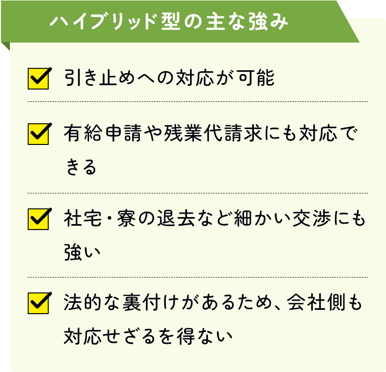 | 労働組合型 | 団体交渉可 | 有給申請 引き止め対応など可能 |
