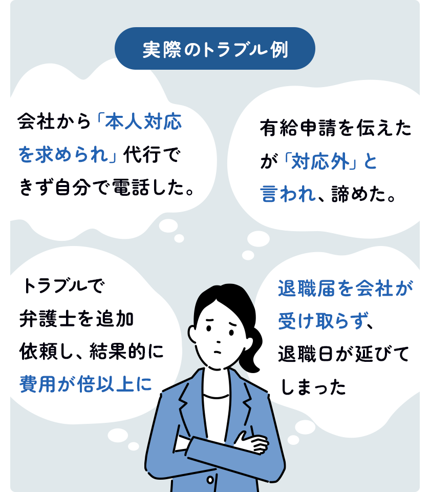 こうした場面で交渉権限がないサービスを選んでしまうと、依頼者が再び会社とやり取りしなければならない事態に…。「結局自分で交渉する羽目になった」「安いけど意味がなかった」という声も少なくありません。