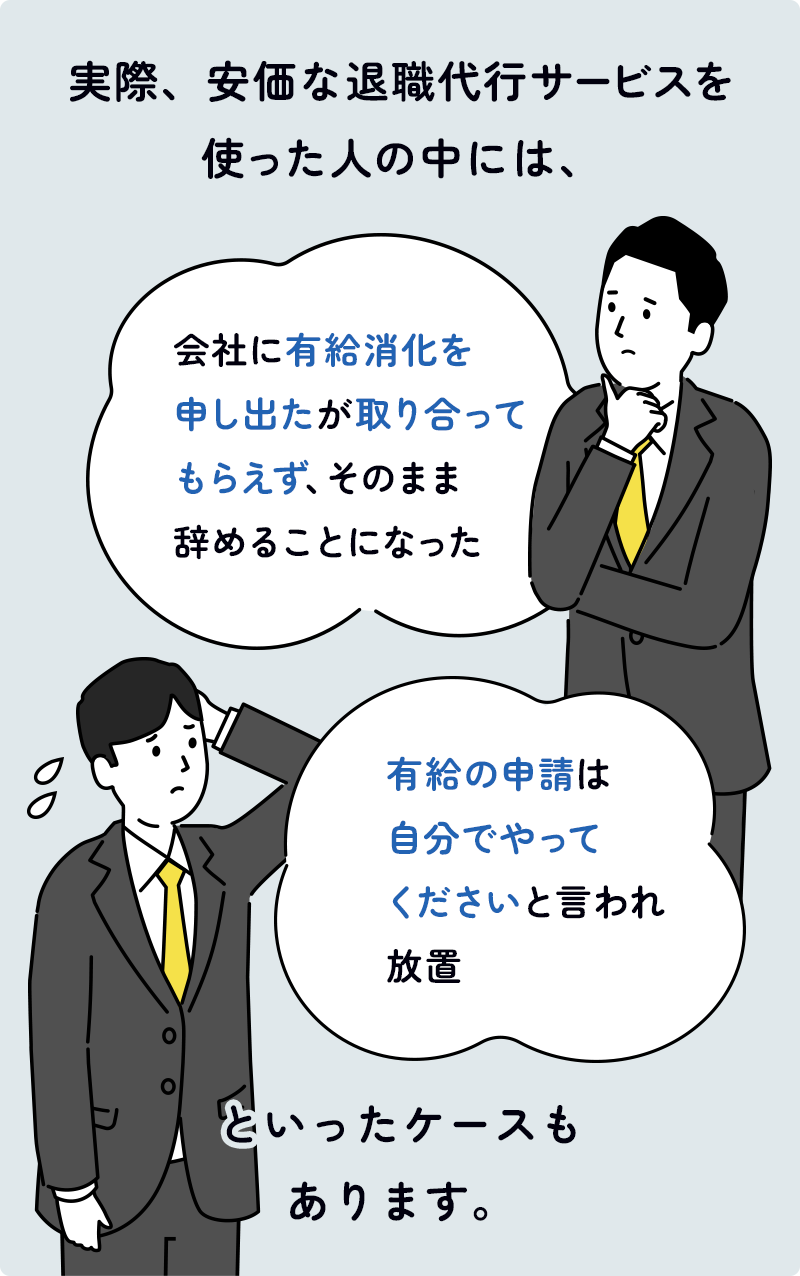 価格が安いサービスの中には、「退職の意思を会社に伝えるだけ」で終わってしまい、有給休暇の申請や社宅の手続きといった実務的な対応は一切できないケースもあります。