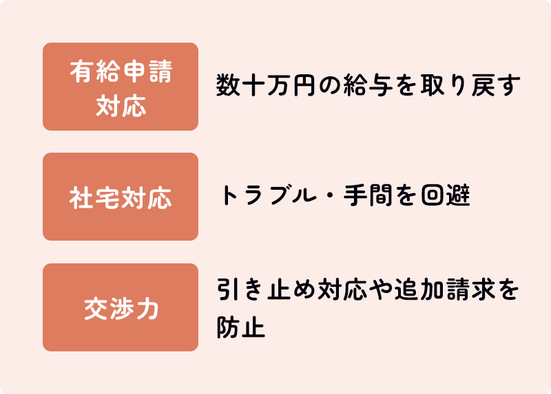 有給申請には会社との交渉が伴うため、労働組合や弁護士監修の体制があるかどうかで対応の可否が大きく変わります。少し高いサービスでも有給申請対応が含まれていれば、差額分は有給だけで十分取り戻せるケースがほとんどです。